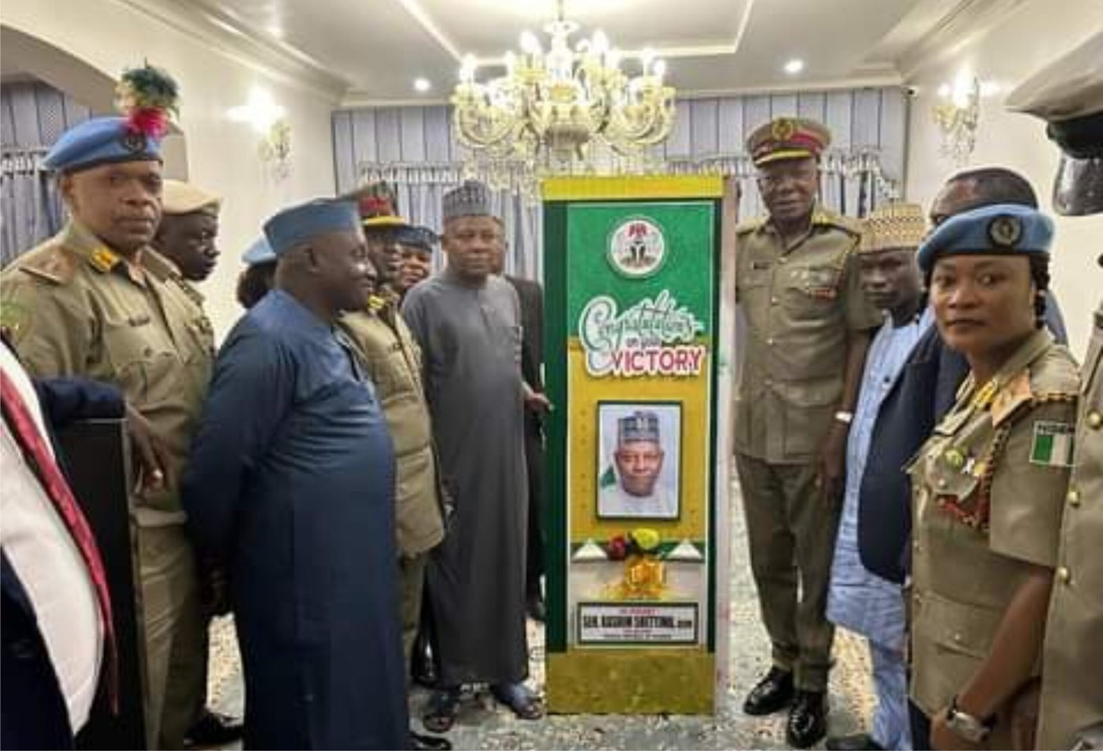 The Vice President-Elect, His Excellency, Kashim Shettima on Saturday, 27 May, 2023 receive the delegation of Peace Corps of Nigeria Officers led by its National Commandant, Prof. Dickson Akoh in his Abuja Residence.