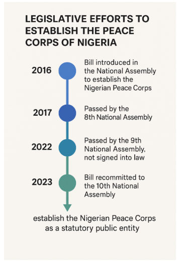 The successful enactment of this Bill will provide the Peace Corps of Nigeria with full legal status as a government-recognized agency, thereby expanding its operational capacity and enhancing its contributions to national development, peace-building, and youth empowerment.